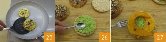 kochen Sie die Tomini in einer heißen Antihaft-Pfanne 2 Minuten pro Seite, bei niedriger Flamme und drehen Sie sie vorsichtig, um sie nicht zu zerreißen 25. Bestreichen Sie die untere Hälfte der Brötchen mit dem Pesto aus den Stängeln des Stängelkohls 26, legen Sie die Kürbisscheiben darauf 27,