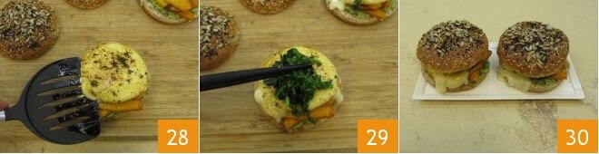 fügen Sie die Tomini hinzu 28 und vervollständigen Sie das Ganze mit den angebratenen Blättern 29, schließlich decken Sie mit der oberen Hälfte der Brötchen ab 30. Ihre Tomini-Burger sind bereit zum Genießen!