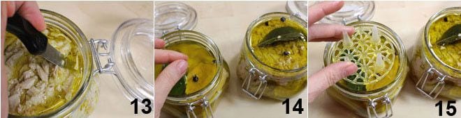 mit Hilfe eines Messers den Thunfisch zerkleinern, damit er vollständig mit Öl durchtränkt wird 13. Auf die Oberfläche jedes Glases legen Sie 3 Wacholderbeeren und ein Lorbeerblatt 14, dann verschließen Sie es luftdicht mit dem speziellen Plastikpressel, wie Sie es auf dem Foto sehen 15; dies dient dazu, den Thunfisch gedrückt zu halten (wenn Sie keine Pressel haben, können Sie sie weglassen).