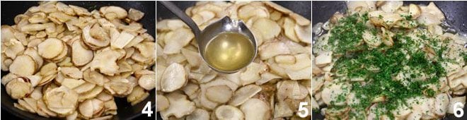 Um Topinambur in der Pfanne zuzubereiten, beginnen Sie mit der Reinigung der Topinambur-Knollen. Reiben Sie zuerst Ihre Hände mit Zitronensaft ein, da Topinambur, wie Artischocken, dazu neigen, sich zu verfärben und dunkle Fingerkuppen zu hinterlassen. Bereiten Sie auch eine Schüssel mit säuerlichem Wasser (mit Zitronensaft) vor, um sie nach dem Reinigen einzutauchen. Schaben Sie mit einem kleinen Messer die Schale der Topinambur ab, um Schmutz und härtere Stellen zu entfernen 1. Waschen Sie sie gut und tauchen Sie sie in das säuerliche Wasser ein, um eine Verfärbung zu vermeiden. Lassen Sie die Topinambur abtropfen und spülen Sie sie ab, schneiden Sie sie in etwa 2/3 mm dünne Scheiben, mithilfe eines scharfen Messers oder einer Mandoline 2, und bereiten Sie eine Antihaftpfanne vor, in der Sie das Olivenöl extra vergine erhitzen und die in Stücke geschnittenen Knoblauchzehen anbräunen lassen 3.