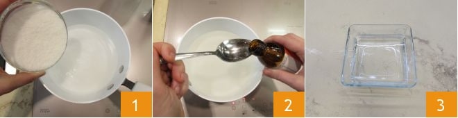 Widmen Sie sich zuletzt der Zubereitung der Tränke. Geben Sie das Wasser und den Zucker 1 in einen Topf. Erhitzen Sie es auf dem Herd, bis sich der Zucker vollständig aufgelöst hat, nehmen Sie es dann vom Herd und fügen Sie das Maraschinoaroma hinzu 2; wenn Sie eine alkoholische Tränke bevorzugen, können Sie Maraschino-Likör verwenden. Füllen Sie die Tränke in eine Auflaufform und lassen Sie sie abkühlen 3.