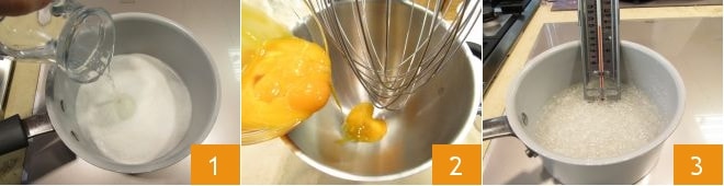 In der Zwischenzeit widmen Sie sich der Zubereitung der Buttercreme. Geben Sie den Zucker mit dem Wasser 1 in einen Topf mit dickem Boden und erhitzen Sie ihn bei niedriger Hitze, dabei gelegentlich mit einem Edelstahllöffel umrühren. In der Zwischenzeit geben Sie die Eigelbe in die Schüssel der Küchenmaschine 2. Wenn sich der Zucker aufgelöst hat, hören Sie auf zu rühren und bringen Sie den Sirup auf 121 °C 3, verwenden Sie ein Küchenthermometer, um die Temperatur zu messen. Schalten Sie die Küchenmaschine ein, um die Eigelbe zu schlagen, sobald der Sirup fast die angegebene Temperatur erreicht hat.