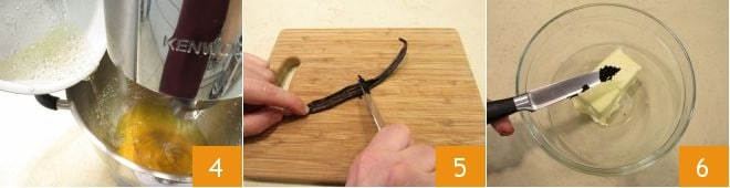 Geben Sie den Sirup in einem dünnen Strahl in die Schüssel der Küchenmaschine 4, der inzwischen die Temperatur erreicht hat, und schlagen Sie weiter, bis die Masse vollständig abgekühlt ist. Schneiden Sie in der Zwischenzeit die Vanilleschote ein und entnehmen Sie die Samen mit einem Messer 5. Geben Sie nun die Butter bei Raumtemperatur in eine Schüssel und fügen Sie auch die Vanilleschotensamen hinzu 6.