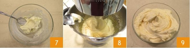 Beginnen Sie mit einem Löffel, die Masse zu verarbeiten, bis sie homogen ist 7. Fügen Sie dann die Vanillebutter in die Küchenmaschine 8 ein, indem Sie einen Löffel nach dem anderen hinzufügen, und schlagen Sie weiter, bis Sie eine cremige Mischung erhalten 9. Geben Sie die Buttercreme in eine Schüssel 9 und bewahren Sie sie bis zur Verwendung im Kühlschrank auf.