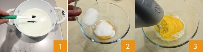 Während der Kuchen backt, widmen Sie sich der Zubereitung der Konditorcreme. Gießen Sie die Milch und die Sahne in einen großen Topf und stellen Sie ihn auf den Herd. Nehmen Sie die Vanilleschote, schneiden Sie sie mit einem Messer auf, entnehmen Sie die Samen und geben Sie sie zusammen mit der Schote in den Topf mit Milch und Sahne 1. Sobald es den Siedepunkt erreicht hat, schalten Sie die Hitze aus und lassen Sie es 5 Minuten lang ziehen. In der Zwischenzeit trennen Sie die Eiweiße von den Eigelben und sammeln Sie sie in einer großen Schüssel. Geben Sie auch den Zucker in die Schüssel mit den Eigelben 2 und schlagen Sie mit einem elektrischen Handmixer 3 oder einem Schneebesen von Hand, bis Sie eine homogene und schaumige Creme erhalten.