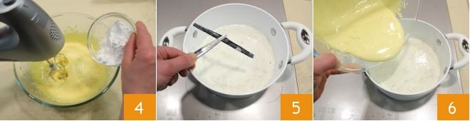 Dann fügen Sie auch die Maisstärke hinzu 4 und schlagen Sie weiter. Entfernen Sie die Vanilleschote aus dem Milch-Sahne-Gemisch 5 und mischen Sie rasch die gerade vorbereitete Mischung aus Eiern und Stärke 6 ein.