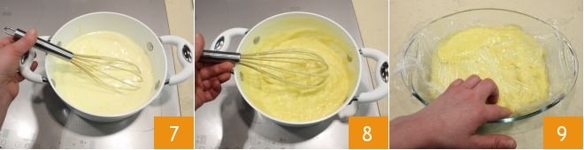 Stellen Sie die Hitze wieder auf niedrig und rühren Sie kontinuierlich um 7, bis Ihre Konditorcreme eingedickt ist 8. Schalten Sie jetzt die Hitze aus und geben Sie die Creme in eine flache und breite Schale. Decken Sie sie sofort mit Frischhaltefolie ab 9, damit sich keine lästige Haut bildet. Lassen Sie sie zuerst bei Raumtemperatur und dann im Kühlschrank abkühlen.