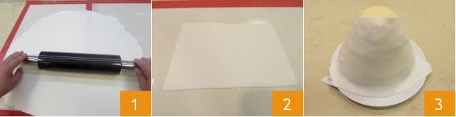 Beginnen Sie nun mit der Dekoration Ihres Barbie-Kuchens. Nehmen Sie 150 g von den 500 g der weißen Zuckermasse und rollen Sie sie auf einer Arbeitsfläche 1 aus, die mit Maisstärke bestäubt ist. Stellen Sie sicher, dass Sie ein Rechteck 2 ausrollen, das dünn genug ist, etwa 2-3 mm dick, um etwa die Hälfte des Kuchens abzudecken. Positionieren Sie es horizontal auf dem Teil des Kuchens, der zu Ihnen zeigt, und lassen Sie es gut auf der Buttercreme haften, ohne den oberen Rand der Zuckermassenschicht über den Biskuit zu falten 3.