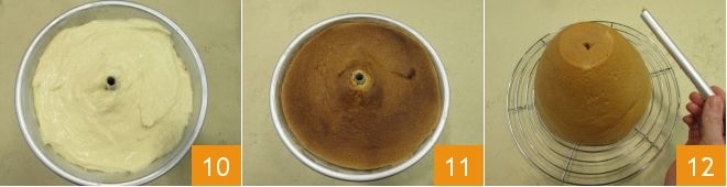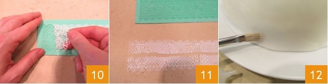 Dann im vorgeheizten statischen Ofen bei 120 °C für 5-6 Minuten backen (oder im vorgeheizten Umluftofen bei 100 °C für etwa 4 Minuten). Achten Sie darauf, die Dekorationsvorbereitung immer zu bedecken, wenn Sie sie nicht verwenden, um ein Austrocknen zu vermeiden. Sobald es aus dem Ofen ist, lassen Sie es abkühlen und entnehmen Sie vorsichtig das Spitzenblatt 10. Schneiden Sie es horizontal in der Hälfte 11 und um es anzuwenden, bepinseln Sie den unteren Teil des Kuchens mit Zuckermasse mit dem essbaren Kleber 12.