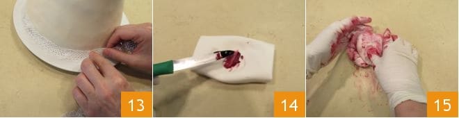 Kleben Sie den Spitzenstreifen gut am Kleber haftend 13. Indem Sie einige Teile der Spitze zwischen Daumen und Zeigefinger zusammendrücken, während Sie sie aufkleben, können Sie auch die Falten formen. Fahren Sie auf diese Weise fort und kleben Sie mit dem essbaren Kleber die verschiedenen Spitzenstreifen von unten nach oben, bis die gesamte Oberfläche bedeckt ist. Nehmen Sie den verbleibenden Teil der Zuckermasse (350 g) und fügen Sie ein paar Tropfen des rosa Farbstoffs 14 hinzu, dann arbeiten Sie sie mit den Händen 15, bis Sie eine homogene Farbe erhalten. Wenn es Ihnen zu hell erscheint, fügen Sie noch einen Tropfen Farbstoff hinzu und arbeiten Sie es erneut, um den gewünschten Farbton zu erhalten.