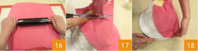 Zu diesem Zeitpunkt rollen Sie auf einer mit Maisstärke bestäubten Arbeitsfläche Ihre rosa Zuckermasse auf eine Dicke von etwa 5-6 mm 16 aus und verwenden Sie sie auch, um die andere Seite des Rocks zu vervollständigen. Legen Sie das Zuckerblatt leicht auf den unbedeckten Teil des Kuchens und verwenden Sie immer den essbaren Kleber, um es an den bereits mit der weißen Zuckermasse bedeckten Teil zu kleben. Versuchen Sie, Falten mit den Fingern zu erzeugen, damit der Rock so natürlich wie möglich aussieht. Schneiden Sie die überschüssige Masse sowohl am oberen 17 als auch am unteren 18 Rand ab.