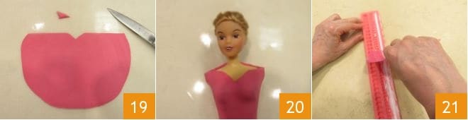 Bearbeiten Sie einige Minuten mit den Händen die Reste der rosa Masse, um sie wieder zu vereinheitlichen. Rollen Sie sie aus und verwenden Sie einen Teil davon, um das Oberteil Ihrer Barbie zu gestalten, indem Sie auch den Ausschnitt reproduzieren, indem Sie einen V-Schnitt am oberen Rand anbringen 19. Decken Sie dann den Oberkörper der Barbie ab 20 und setzen Sie auch die Arme wieder ein. Verwenden Sie die Dekorationsvorbereitung und geben Sie wie zuvor für die Spitze einen Löffel davon auf eine Matte für die Perlenherstellung, und kratzen Sie mit einem Spatel ab 21.