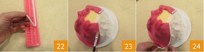 Backen Sie erneut im vorgeheizten statischen Ofen bei 120 °C für 5-6 Minuten. Lassen Sie es abkühlen und extrahieren Sie dann den Perlstreifen 22 und kleben Sie ihn mit essbarem Kleber am Rand des Rocks (23-24). Bewahren Sie ein kleines Stück auf, das Sie für das Halsband und das Armband verwenden können.