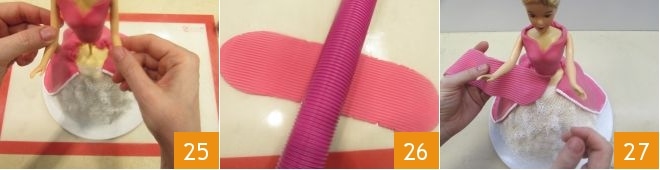 Setzen Sie nun den Oberkörper der Barbie in das Loch in der Mitte des Kuchens 25. Um die letzten Verzierungen zu machen, verwenden Sie die restliche rosa Zuckermasse und formen Sie einen Streifen, etwa 6-7 cm breit. Verzieren Sie ihn mit einem Nudelholz für das Cake Design, das Ihnen horizontale Linien ermöglicht 26. Formen Sie die Ränder mit einem Messer, bepinseln Sie die Rückseite mit essbarem Kleber und kleben Sie es zwischen den Oberkörper und den Rock, um die unbedeckten Teile zu verdecken 27.