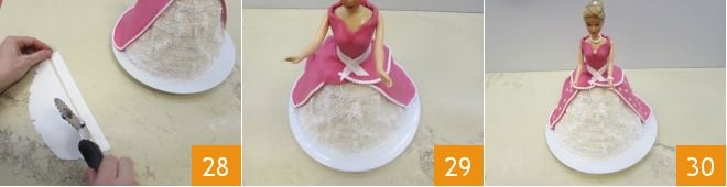 Rollen Sie die Reste erneut aus und schneiden Sie mit einem Messer das Diadem aus und platzieren Sie es auf den Haaren der Barbie. Platzieren Sie auch den Perlstreifen um den Hals und verbinden Sie die beiden Enden mit Kleber, wiederholen Sie denselben Vorgang um den Arm, um das Armband herzustellen. Rollen Sie auch die restliche weiße Zuckermasse aus und schneiden Sie einen Streifen von etwa 1,5 cm 28, bepinseln Sie die Rückseite mit Kleber und kleben Sie ihn an die Taille der Barbie, um den Gürtel zu bilden 29. Machen Sie mit den Resten der Masse kleine Blumen, um den Rock zu verschönern. Ihr Barbie-Kuchen ist fertig 30, stellen Sie ihn für ein paar Stunden in den Kühlschrank, bevor Sie ihn servieren.