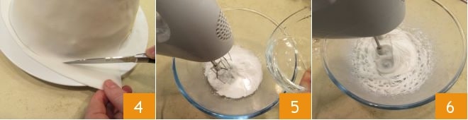Schneiden Sie den überschüssigen Teil der Zuckermasse am Boden des Kuchens ab, indem Sie den genauen Umriss des Kuchens schneiden 4, um zu vermeiden, dass er über das Tablett hinausgeht. Formen Sie die Reste der Masse mit den Händen und legen Sie sie für die endgültigen Dekorationen zur Seite, eingewickelt in Frischhaltefolie. Stellen Sie den Kuchen in den Kühlschrank und widmen Sie sich den Dekorationen. Erwärmen Sie das Wasser in der Mikrowelle und bringen Sie es auf eine Temperatur von 40 °C, dann fügen Sie es in eine Schüssel, in der Sie bereits die Vorbereitung für Dekorationen 5 gegossen haben. Mischen Sie mit einem Mixer, bis Sie eine cremige Mischung erhalten 6.
