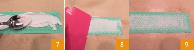 Nehmen Sie einen Löffel dieser Mischung und verteilen Sie ihn auf einer Silikonmatte, die für die Herstellung von Spitzen geeignet ist 7. Mit einem Spatel die Oberfläche abkratzen 8, um die überschüssige Menge zu entfernen 9.