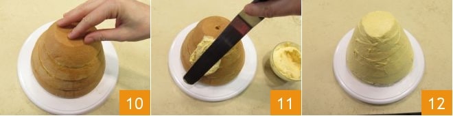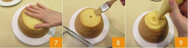 Fahren Sie auf diese Weise fort, indem Sie die richtige Schicht des Biskuits 7 von der größten zur kleinsten positionieren, um den Kuchen wieder zu zusammensetzen. Vollenden Sie Ihren Kuchen, indem Sie jede Schicht befeuchten 8 und mit der Konditorcreme füllen 9.