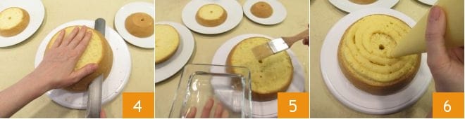 Erst wenn alle Zubereitungen vollständig abgekühlt sind, schneiden Sie den Kuchen. Teilen Sie Ihren Biskuit in 4 Scheiben 4. An diesem Punkt haben Sie alles, was Sie brauchen, um den Kuchen zusammenzustellen. Beginnen Sie damit, die breiteste Schicht des Biskuits mit der zuvor vorbereiteten Tränke (nunmehr kalt) zu befeuchten, indem Sie einen Pinsel verwenden 5. Geben Sie die Konditorcreme in einen Spritzbeutel und fügen Sie sie in kreisförmiger Weise auf die zuvor befeuchtete Tortenschicht 6 auf.