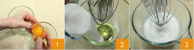 Um den Barbie-Kuchen zuzubereiten, beginnen Sie als erstes mit der Zubereitung des Biskuitteig, mit der kalten Methode. Nehmen Sie die Eier, die Zimmertemperatur haben sollten, und trennen Sie das Eiweiß von den Eigelben 1. Geben Sie das Eiweiß in die Schüssel der Küchenmaschine, fügen Sie eine Prise Salz und etwa 1/3 der angegebenen Gesamtmenge Zucker hinzu 2. Um das Beste aus dem Eischnee herauszuholen, sollte kein Eigelb im Eiweiß enthalten sein, und sowohl die Schüssel als auch der Schneebesen der Küchenmaschine sollten sauber sein. Stellen Sie die Maschine auf mittlere Geschwindigkeit ein und schlagen Sie das Eiweiß glänzend und nicht steif, um eine gleichmäßige Masse zu erhalten, die keine Klumpen im Teig bildet; wenn Sie keine Küchenmaschine haben, können Sie problemlos einen elektrischen Handmixer verwenden. Wenn das Eiweiß weiß, ausreichend aufgebläht und weich ist, stoppen Sie die Küchenmaschine 3.