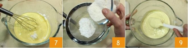 Und mischen Sie mit einem Schneebesen 7 (oder einem Spatel) von oben nach unten, um die Mischung nicht zu entleeren. Fügen Sie nun das gesiebte Mehl und die Stärke hinzu 8 und mischen Sie sie mit einem Spatel in die Mischung ein 9.