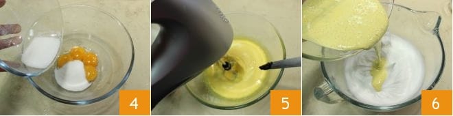 Schlitzen Sie in der Zwischenzeit eine Vanilleschote mit einem Messer auf, entnehmen Sie die Samen und legen Sie sie beiseite. Geben Sie den restlichen Zucker (die anderen 2/3) in die Schüssel mit den Eigelben 4 und beginnen Sie mit einem elektrischen Handmixer auf mittlerer Geschwindigkeit zu schlagen. Fügen Sie auch die Vanilleschotensamen hinzu 5 und rühren Sie alles, bis Sie eine schaumige Mischung mit einer guten Alveolierung und einer hellgelben Farbe erhalten. Fügen Sie die geschlagenen Eigelbe vorsichtig zum Eiweiß hinzu 6.