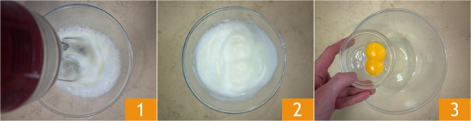 Um den Pistazien-Caprese-Kuchen vorzubereiten, trennen Sie zunächst die Eigelbe von den Eiweißen. Schlagen Sie das Eiweiß 1 zu steifem Schnee 2 und stellen Sie es beiseite. Geben Sie die Eigelbe in eine andere Schüssel 3.