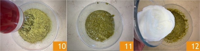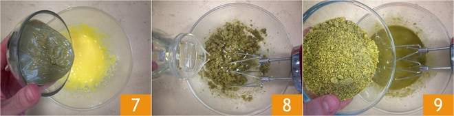 Fügen Sie die Pistazienpaste hinzu 7 und mischen Sie erneut, um alles zu vermischen. Fügen Sie dann das Pflanzenöl 8 und das Pistazienmehl hinzu 9.