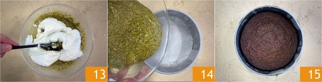 Vorsichtig von unten nach oben mischen, damit der Eischnee nicht zusammenfällt 13. Geben Sie alles in eine mit Backpapier ausgelegte Springform mit einem Durchmesser von 20 cm 14 und backen Sie im vorgeheizten statischen Ofen bei 170°C für 30 Minuten 15.