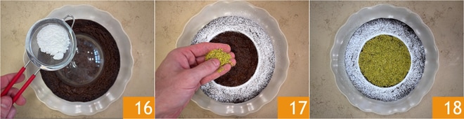 Lassen Sie den Kuchen vollständig abkühlen, dann stellen Sie eine Schale in die Mitte des Kuchens und bestäuben ihn mit Puderzucker 16. Entfernen Sie die Schale und dekorieren Sie den leeren Raum mit Pistazienmehl 17. Ihr Pistazien-Caprese-Kuchen ist bereit zum Genießen 18!