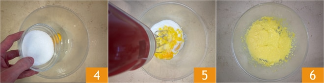 Fügen Sie den Zucker hinzu 4 und schlagen Sie mit einem elektrischen Mixer 5, bis eine homogene Mischung entsteht 6.