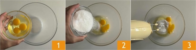 Um den Kuchen mit griechischem Joghurt zuzubereiten, beginnen Sie damit, die ganzen Eier in eine große Schüssel zu geben 1. Fügen Sie den Zucker hinzu 2 und schlagen Sie Eier und Zucker mit den elektrischen Schneebesen 3.