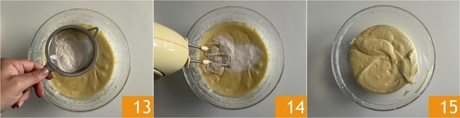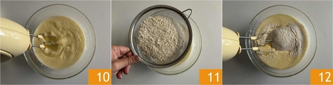 Arbeiten Sie die Mischung weiterhin mit den elektrischen Schneebesen 10 und fügen Sie das Mehl hinzu, indem Sie es sieben und nach und nach einstreuen 11, dann nochmals mischen 12, bis die Mischung cremig, glatt und gleichmäßig ist.