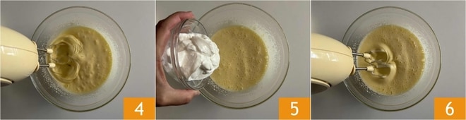 Wenn die Mischung luftig, hell und schaumig ist 4, fügen Sie den griechischen Joghurt hinzu 5 und mischen Sie ihn mit den Schneebesen unter 6.