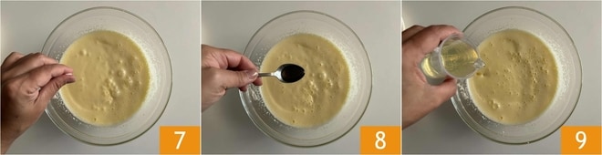 Anschließend eine Prise Salz 7, das Vanilleextrakt 8 und das Öl 9 hinzufügen.