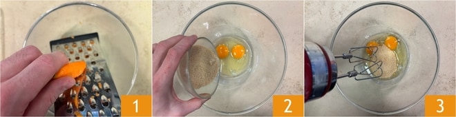 Um den superweichen Karottenkuchen zuzubereiten, schälen und reiben Sie zuerst die Karotten mit einer groben Reibe 1. Geben Sie die Eier und den braunen Zucker in eine Schüssel 2 und schlagen Sie sie mit einem elektrischen Handmixer auf 3.