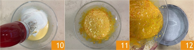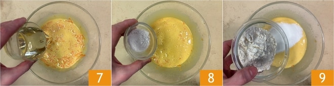 Gießen Sie das Pflanzenöl 7 hinzu und vermengen Sie alles. An diesem Punkt fügen Sie das Backpulver 8, die Speisestärke und das zuvor gesiebte Mehl hinzu 9.