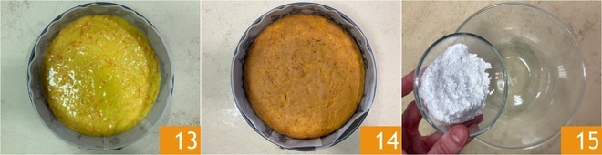 Backen Sie im vorgeheizten statischen Ofen bei 180°C für etwa 35-40 Minuten 13. Überprüfen Sie die Garung mit einem Zahnstocher; wenn er sauber herauskommt, nehmen Sie den Kuchen aus dem Ofen und lassen Sie ihn vollständig in der Form abkühlen 14. In der Zwischenzeit bereiten Sie das Frosting vor: Geben Sie den Puderzucker in eine Schüssel 15.