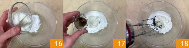 Fügen Sie den griechischen Joghurt 16 und das Vanilleextrakt 17 hinzu und vermengen Sie alles mit dem elektrischen Handmixer 18.