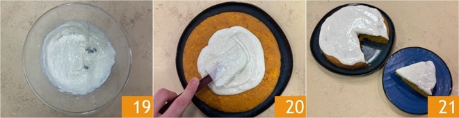 Sie sollten eine glatte und homogene Creme erhalten 19. Sobald der Kuchen vollständig abgekühlt ist, verteilen Sie das Frosting mit einem Spatel auf der gesamten Oberfläche 20. Ihr superweicher Karottenkuchen ist bereit zum Genießen 21!