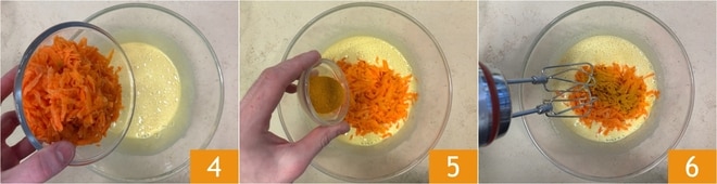Wenn Sie eine helle und schaumige Masse erhalten haben, fügen Sie die geriebenen Karotten 4 und das Kurkuma 5 hinzu und mischen Sie erneut mit dem Handmixer 6.