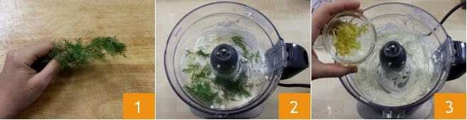 Um den Lachskuchen vorzubereiten, beginnen Sie mit der Zubereitung der Dill-Frischkäsecreme: Waschen Sie den Dill und bewahren Sie einige Büschel zur Dekoration auf 1. Geben Sie den Frischkäse, einen Esslöffel Milch, um die Creme weich zu machen, den Dill 2 und die abgeriebene Schale einer halben Zitrone 3 in einen Mixer (Sie können auch einen elektrischen Mixer oder einen Schneebesen verwenden) und pürieren Sie alles. Sie sollten eine weiche und dicke Creme erhalten.