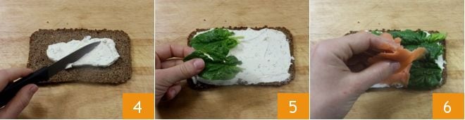 Setzen Sie den Kuchen zusammen: Nehmen Sie eine Scheibe rechteckiges Brot (wenn es eine andere Form hat, schneiden Sie es nach Belieben zu), legen Sie es auf das Schneidebrett und bestreichen Sie es mit der Creme 4, fügen Sie dann einige gewaschene und getrocknete Spinatblätter und ein paar Scheiben Lachs hinzu (5-6).
