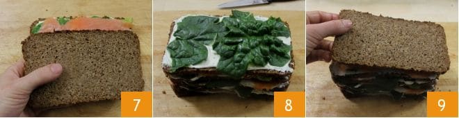 Bedecken Sie es mit einer weiteren Scheibe Brot 7 und beginnen Sie erneut mit der Frischkäsecreme, dem Spinat und dem Lachs, bis alle Zutaten verbraucht sind 9. Beenden Sie mit einer Scheibe Brot 9 und stellen Sie den Lachskuchen in den Kühlschrank, um ihn fest werden zu lassen.