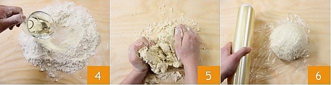 Mischen Sie mit den Händen und fügen Sie nach und nach den Weißwein in einem dünnen Strahl hinzu 4. Fügen Sie die Vanillesamen hinzu und kneten Sie kräftig mit den Händen 5, bis Sie einen kompakten und gut vermischten Teig erhalten. Decken Sie den Teig mit Frischhaltefolie ab 6 und lassen Sie ihn 20 Minuten im Kühlschrank ruhen.