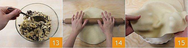 Vermischen Sie die Zutaten gut mit einem Löffel 13. Rollen Sie nun den Mürbeteig mit Hilfe eines Nudelholzes auf eine Dicke von einem halben cm aus 14 und bedecken Sie damit eine gut gebutterte und bemehlte Backform mit einem Durchmesser von 27 cm 15.