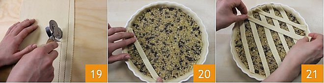 Entfernen Sie den überschüssigen Teig, indem Sie die Ränder der Backform mit dem Nudelholz pressen 16 und füllen Sie den Kuchen mit der Füllung 17 und glätten Sie diese gut mit einem Löffel 18.