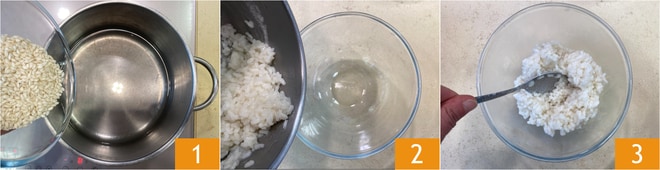 Um den süßen Reis-Ricotta-Kuchen zuzubereiten, geben Sie zuerst das Wasser und den Reis 1 in einen Topf, schalten Sie die Herdplatte ein und kochen Sie es etwa 25 Minuten lang, bis der gesamte Flüssigkeit absorbiert ist. Sobald der Reis gar ist, geben Sie ihn in eine Schüssel 2 und lassen Sie ihn vollständig abkühlen 3.