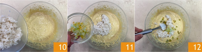 Fügen Sie schließlich den Reis 10 und die kandierten Früchte 11 hinzu und mischen Sie sie gleichmäßig unter 12.