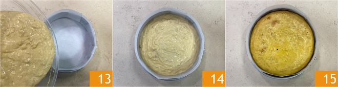 Gießen Sie die Mischung in eine mit Backpapier ausgelegte Springform mit einem Durchmesser von 22 cm 13, wobei das Papier in der Höhe aus der Form herausragen sollte, da der Kuchen beim Backen aufgeht. Glätten Sie die Oberfläche 14 und backen Sie ihn im statischen Ofen bei 170° für etwa 80 Minuten 15.
